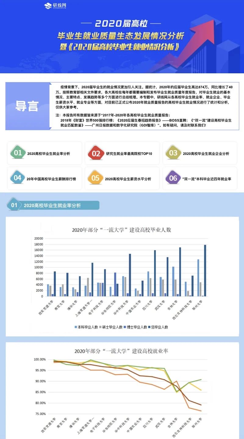 在《2020届高校毕业生就业情况分析》中,研线网从签约企业、薪酬水平、热门专业就业去向等具体内容,详细分析了各高校毕业生就业趋势,帮助考生更好地选择深造院校,做好职业规划。