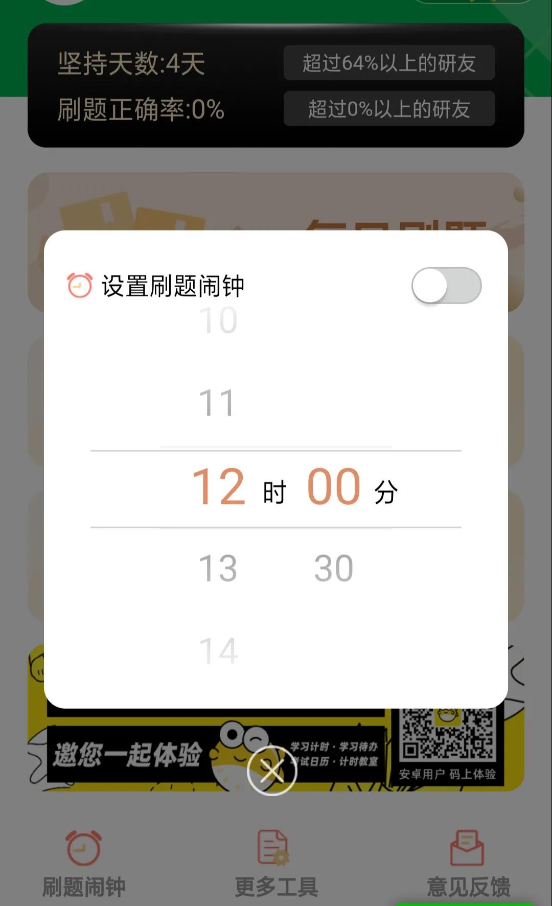 担心自己懒癌又犯使政治刷题大业荒芜?刷题闹钟专属叫醒贴心服务上线!根据你的复习计划设置刷题闹钟提醒,努力成为一名合格的时间管理大师。