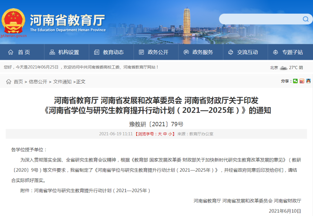 河南省教育厅印发《河南省学位与研究生教育提升行动计划(2021—2025年)》,例如:主要任务(三)实施教育规模扩容行动,统筹学位授权布局,有效扩大高层次人才培养规模;主要任务(六)实施专业学位提质行动,加强产教融合,着力办好专业学位研究生教育。都是和今年考生密切相关的重要信息。