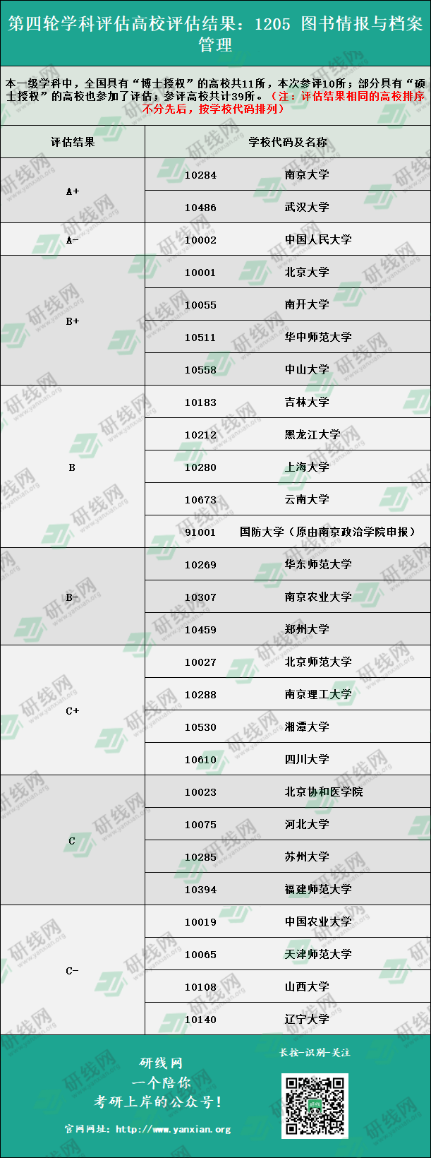 下面是全国第四轮学科评估结果1205图书情报与档案管理的院校排名,供大家择校参考。(注:评估结果相同的高校排序不分先后,按学校代码排列)