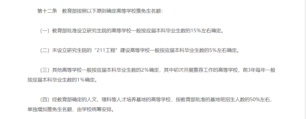 经教育部确定的人文、理科等人才培养基地的高等学校,按教育部批准的基地班招生人数的50%左右,单独增加推免生名额,由学校统筹安排;对国家发展急需的专业适当增加推免生名额。
