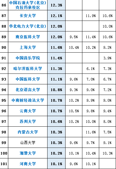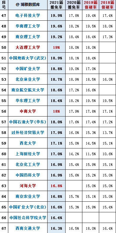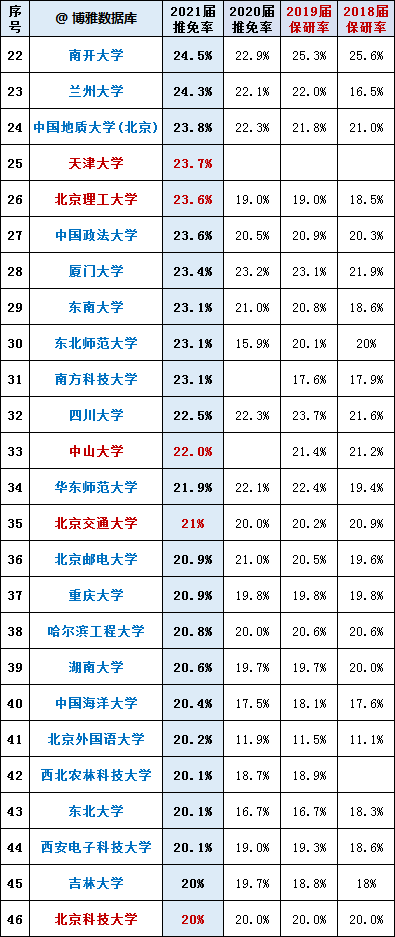 多数情况下,双一流院校、优势学科、基础学科院校推免率偏高。在@博雅数据库推免率top100院校排名表中(如下图)可以看到,清华、北大2020年保研率均超过50%。