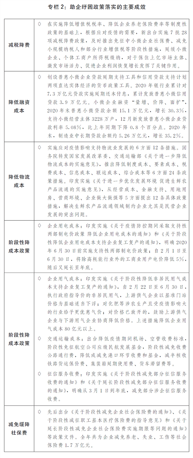二是助企纾困政策有效实施。减税降费红利深度释放,实施阶段性大规模减税降费,阶段性减免小规模纳税人增值税,阶段性减免养老、失业、工伤三项社会保险单位缴费部分,减半征收职工医疗保险单位缴费部分,落实住房公积金阶段性支持政策,全年为市场主体减负超过2.6万亿元。创新宏观政策实施方式,中央财政对新增2万亿元资金建立直达机制,省级财政加大资金下沉力度,共同为市县基层落实惠企利民政策及时补充财力。通过降低存款准备金率、中期借贷便利、公开市场操作、再贷款再贴现、创新直达实体经济的货币政策工具等方式,共推出9万多亿元的货币支持措施。通过贷款市场报价利率(LPR)改革推动社会融资成本下降。大型商业银行普惠小微企业贷款增长50%以上,全年金融系统向实体经济让利1.5万亿元。阶段性对部分服务业小微企业和个体工商户减免缓收房屋租金。
