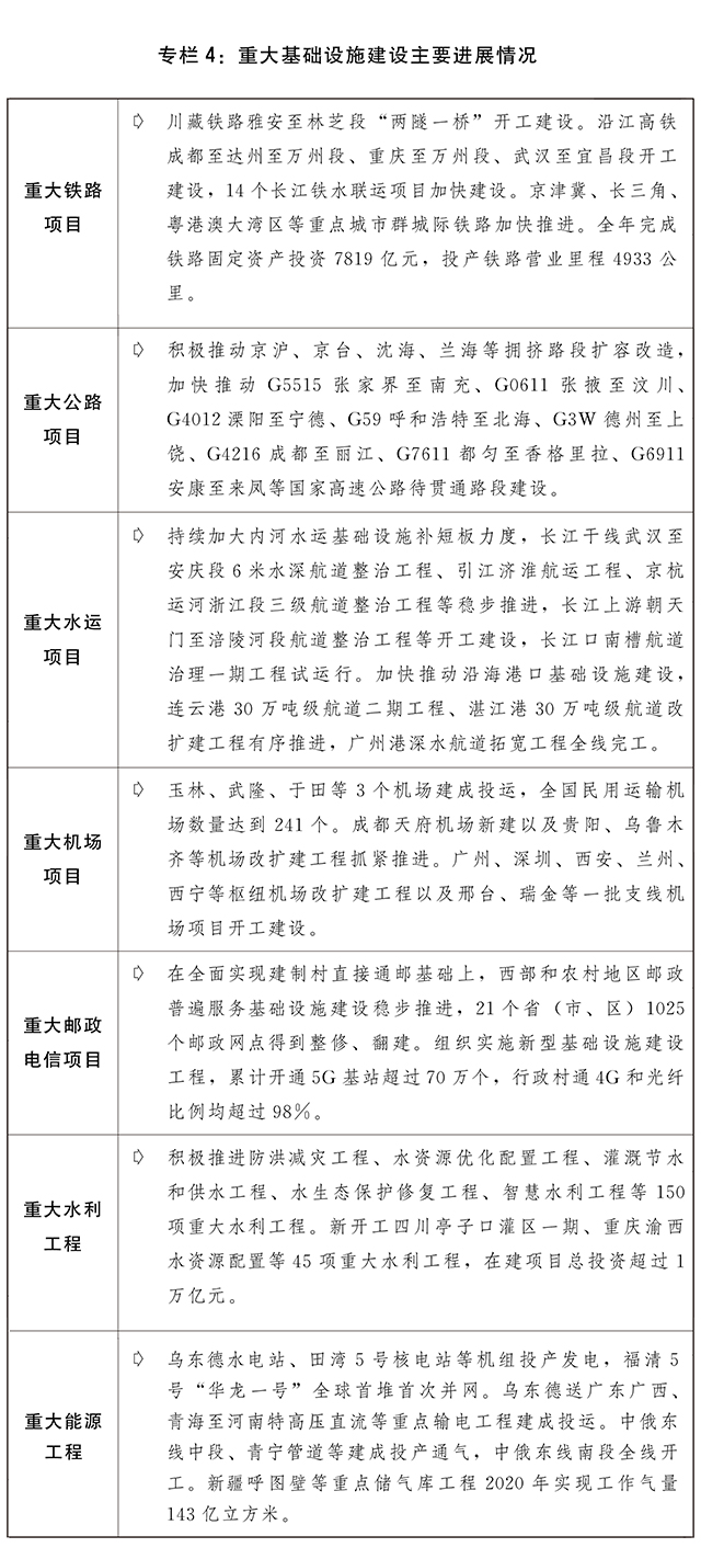 二是增强投资增长后劲。坚持“项目跟着规划走,资金要素跟着项目走”,加快国家重大战略项目实施步伐,加强重大项目资金、用地等要素保障。发挥中央预算内投资在外溢性强、社会效益高领域的引导和撬动作用,安排中央预算内投资6100亿元,比上年增加100亿元。新增地方政府专项债券规模为3.65万亿元,优先支持在建工程,合理扩大使用范围。激发全社会投资活力,形成市场主导的投资内生增长机制。协同推进投资审批制度改革、开展投资领域专项执法检查,着力深化在线平台建设应用。加大新型基础设施投资力度,谋划布局5G、数据中心、基础软件、空间基础设施等建设。支持城市防洪排涝设施建设,加强城市内涝治理。稳步推进川藏铁路、西部陆海新通道等重大项目建设,完善机场布局,加快推进三峡枢纽水运新通道建设前期工作,实施国家水网、航道网工程,有序推进油气和电力等重大能源工程。稳妥推进基础设施领域不动产投资信托基金试点,推动盘活存量资产,形成投资良性循环。规范推广政府和社会资本合作模式,吸引民间资本参与。