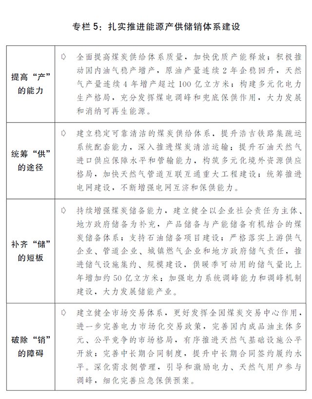 二是保障能源资源安全。继续推进能源产供储销体系建设,加强网络布局、规划建设、运行管理、调配调度等方面有机衔接。优化煤炭生产开发布局和产能结构,系统提升煤炭供应保障能力。提升电力运行水平,推进风光水火核储一体化发展,充分发挥煤电调峰、应急、支持和兜底保供作用。大力提升油气勘探开发力度,实施天然气管网互联互通工程,强化油气供应保障基础。积极推进能源通道建设,增强能源储备能力,提升运输保障能力。完善应急保障预案,提升风险应对和应急调节能力,增强能源安全韧性。继续开展找矿突破战略行动,实施矿产地储备工程,全面推进矿业权竞争性出让,积极推进“净矿出让”,调动各类市场主体积极性。加强矿产资源开发管理和保护,提升战略性矿产资源储备安全保障能力。积极参与全球矿业治理,持续开展国际矿业合作。