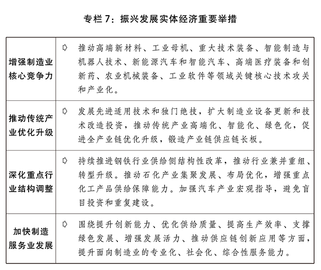 二是着力振兴和发展实体经济。实施新一轮制造业核心竞争力提升五年行动计划,开展先进制造业集群发展专项行动,创建国家制造业高质量发展试验区。对先进制造业企业按月全额退还增值税增量留抵税额,提高制造业贷款比重,扩大制造业设备更新和技术改造投资。加快重点行业结构调整和绿色化改造,持续推进国家战略性新兴产业集群发展工程,强化技术创新和公共服务。落实新时期促进集成电路产业和软件产业高质量发展的若干政策。加强产业管理,促进新能源汽车健康有序发展,加快构建智能汽车基础设施、产业生态等支撑体系。加快壮大新能源等产业,提升新能源消纳和存储能力。培育壮大生物经济,推动生物技术融合发展。加快临床急需用药和高端医疗装备开发及产业化。推动北斗大规模应用及产业化发展。稳步提升航空产业链现代化和国际化水平。继续推动先进制造业和现代服务业融合试点。依托工业互联网、工业软件等新一代信息技术,加快制造服务业发展。进一步完善废旧家电回收处理体系,畅通家电生产、消费、回收、处理全链条。实施中华老字号保护发展工程。办好2021年中国品牌日活动。