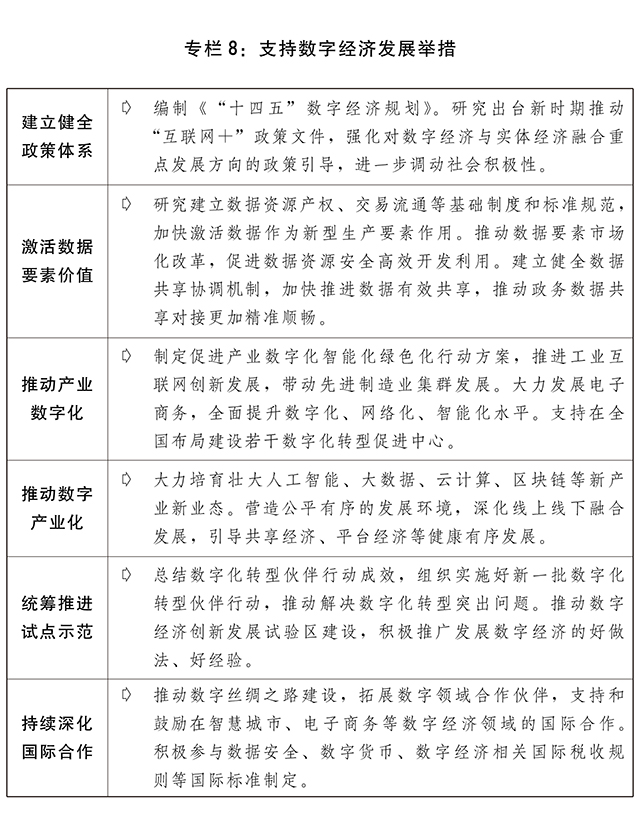 三是加力推动数字化发展。发展数字经济,推进数字产业化和产业数字化,打造具有国际竞争力的数字产业集群。培育数据要素市场,发挥好数据要素关键作用。推动数字政府建设,持续推进实施国家政务信息化重大工程,加快打造数字化一流营商环境。深入推进全国一体化大数据中心体系建设,做好数据中心建设布局,促进数据资源有序流通和创新应用。积极参与数字领域国际规则和标准制定。