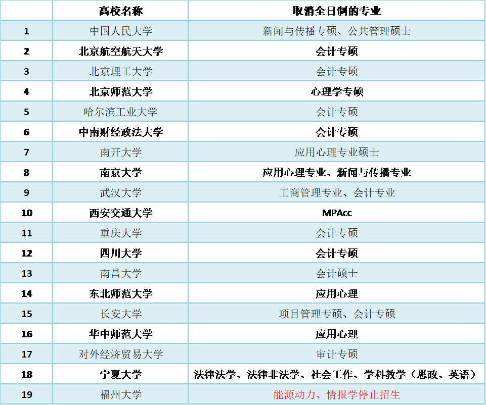 目前已有多所院校某些专业停招全日制或者新增非全日制招生,以下是取消全日制的专业汇总,可供参考: