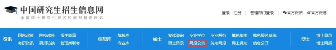 中国研究生招生信息网(https://yz.chsi.com.cn/)是全国硕士研究生招生报名和调剂指定网站,在研招统考网报时,要用已注册的学信网账号登录网报系统进行报名。