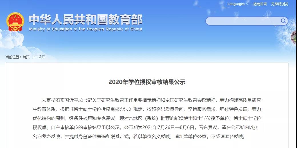 根据《博士硕士学位授权审核办法》规定,按照突出质量导向、坚持服务需求、强化特色发展、着力优化结构的原则,经条件核查和专家评议,现对各地区(系统)推荐的新增博士硕士学位授予单位、博士硕士学位授权点、自主审核单位的审核结果予以公示,公示期为2021年7月26日—8月6日。若有异议,请在公示期内以实名向我办反映,并提供身份证件号码和联系方式。若以单位名义反映,请加盖单位公章。不受理匿名反映。