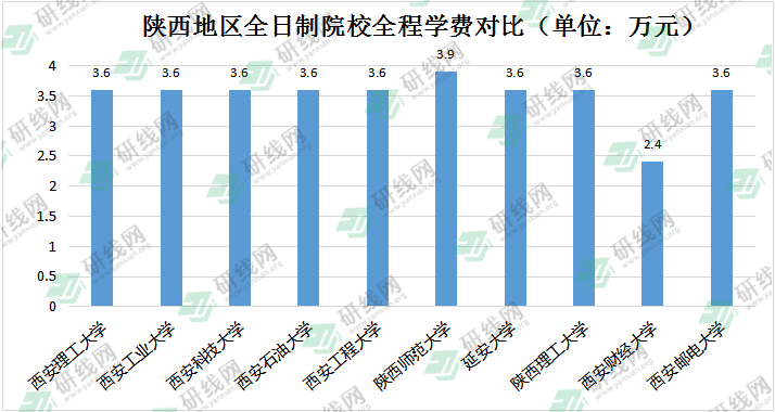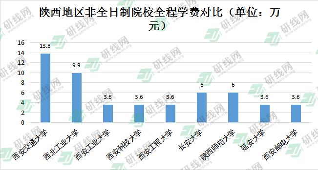 陕西地区全日制院校全程学费相差不大,最高3.9万,最低2.4万。非全日制学费差距较大,高性价比院校推荐: