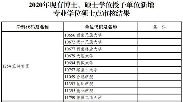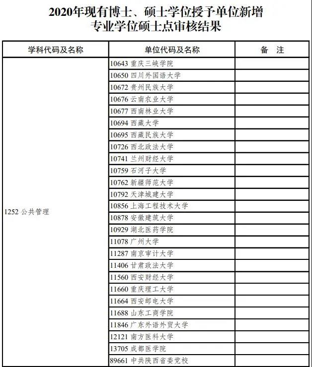 在《2020年学位授权审核结果公示》中,新增管理类联考(七大专业)专业学位硕士共计178个,以下是详细名单: