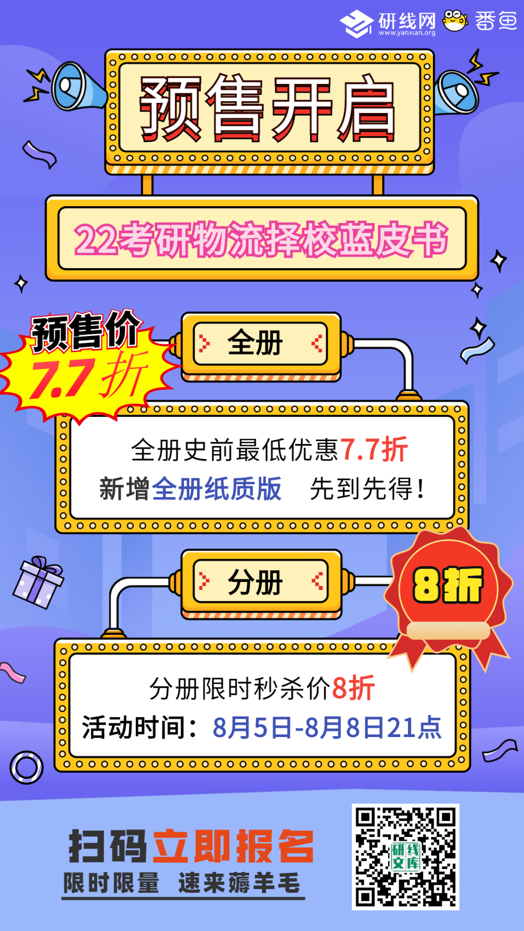 8月8日晚6:00,研线小姐姐带你领读《22拼搏在线官网物流择校蓝皮书》,看看纸质版蓝皮书到底长啥样!直播间同时享受优惠折扣,还将不定时掉落惊喜礼包,想要白嫖蓝皮书?来直播间试试吧!