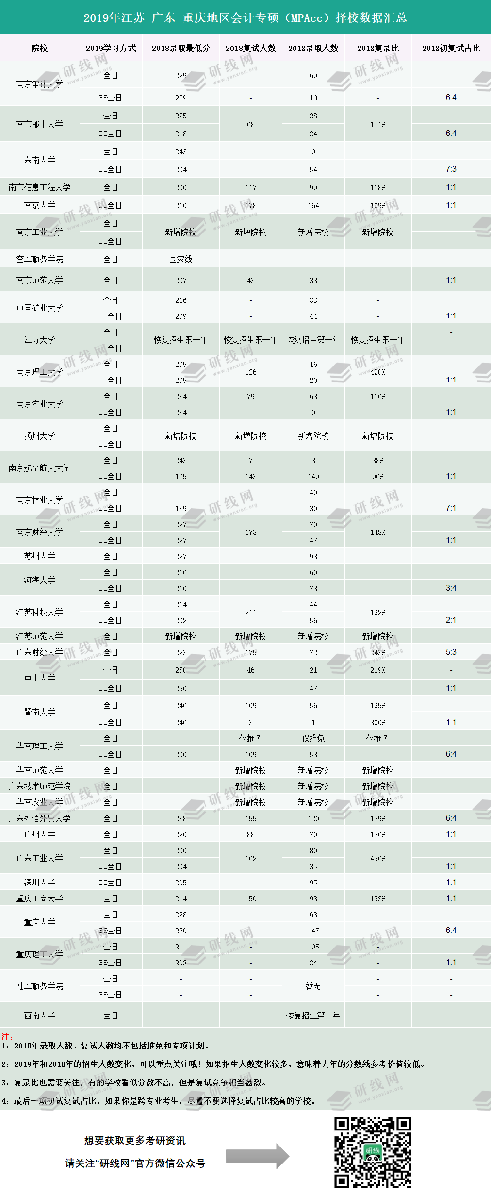 以上是江苏、广东、重庆地区会计专硕(MPAcc)择校数据汇总,提供给大家参考!具体情况查询各院校官网,希望大家都能报考到理想院校。