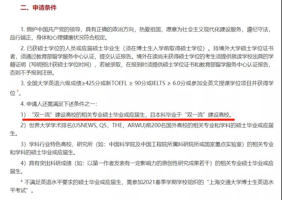 无论是“英语六级必须≥425分;有影响因子大于XX的独立一作SCI文章;获得过国家和省部级奖学金”,还是“本科毕业于‘双一流’建设高校”的申请条件,都能够将许多怀揣“博士梦”的考生直接“拒之门外”。