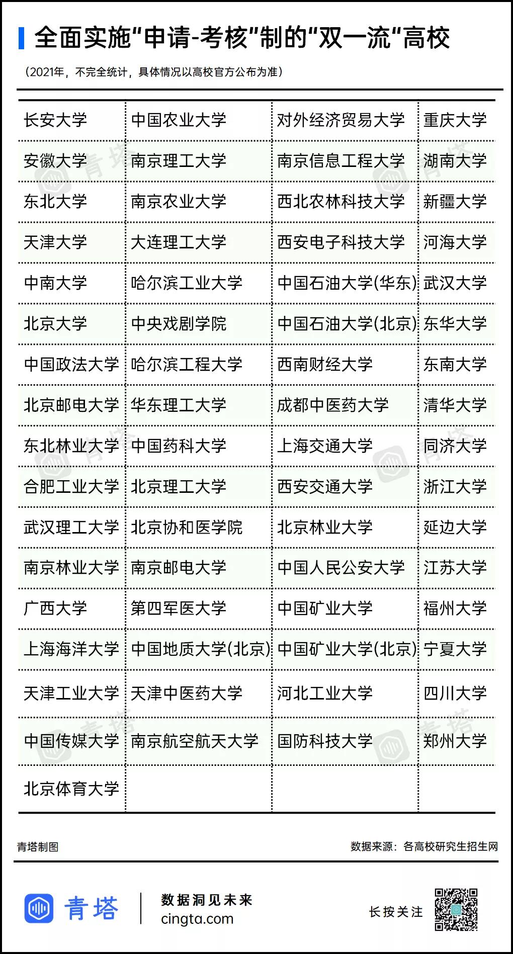 据不完全统计,在全国140所“双一流”建设高校中,至少有131所高校已经开始在博士招生方式中,全面或部分实行“申请-考核”制,占比超过93%;其中,42所一流拼搏(中国)建设高校均已开始推行申请-考核”制。