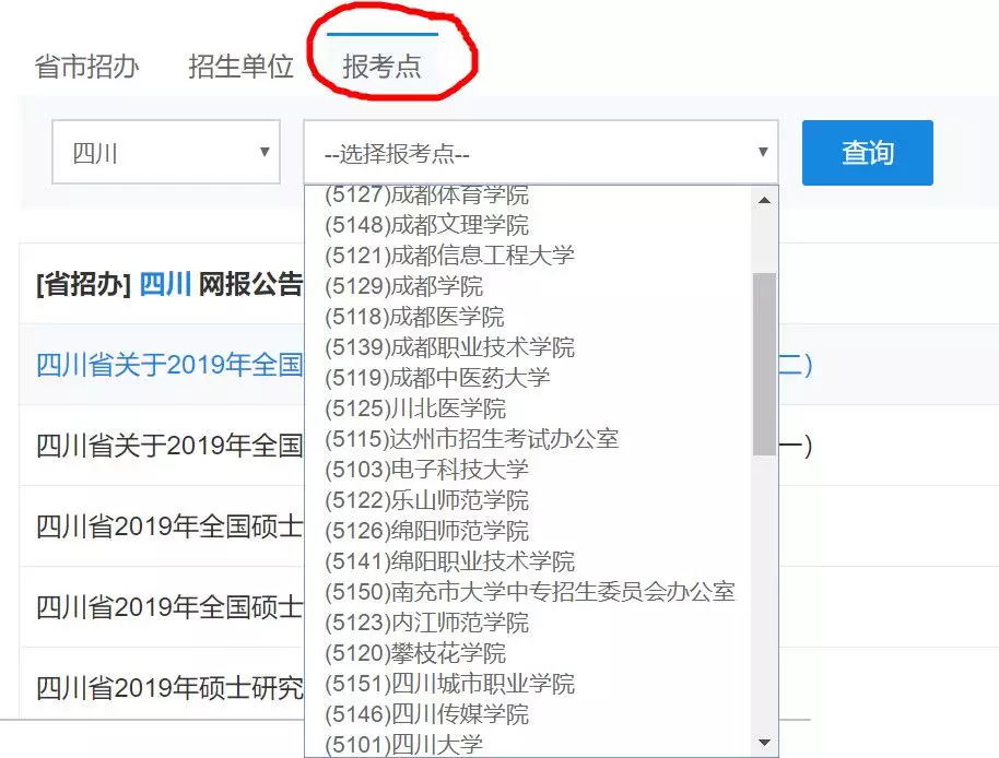 打开中国研究生招生信息网官网,首页菜单选择【网报公告】点击进入之后,按照下图,一定要选择自己报名时选的报考点,点击查询就可以看到啦!
