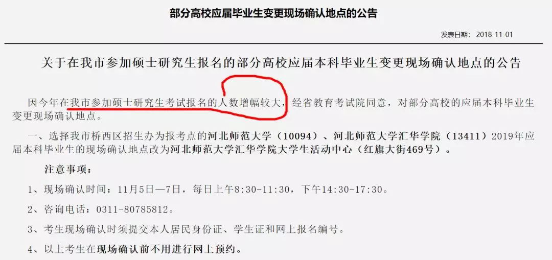 近期,石家庄教育考试院就发布公告,因为今年考试报名人数增幅较大,对部分高校应届本科毕业生变更现场确认地点。在石家庄报考的小伙伴们注意到查看相关信息。