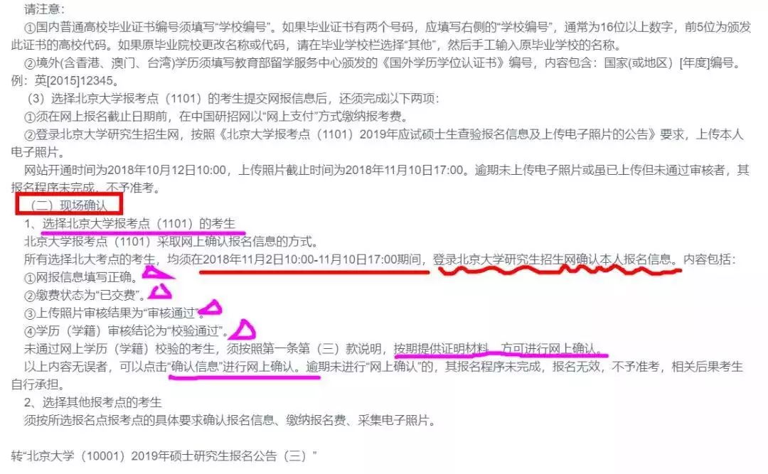 所有选择北大考点的考生,均须在2018年11月2日10:00-11月10日17:00期间,登录北京拼搏(中国)研究生招生网进行本人报名信息确认。注:11月8日至10日不设现场确认,不受理补交报名费。