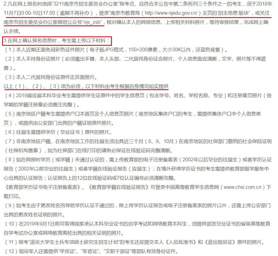 须于2018年11月7日至11月10日(逾期不再补办),登录南京市教育局主页或南京市招生委员会办公室微信公众号“njs_zsb”,修改核对本人的网报信息、上传本人证件照片、上传身份证等其他相关材料照片,等待审核结果,完成网上确认手续。