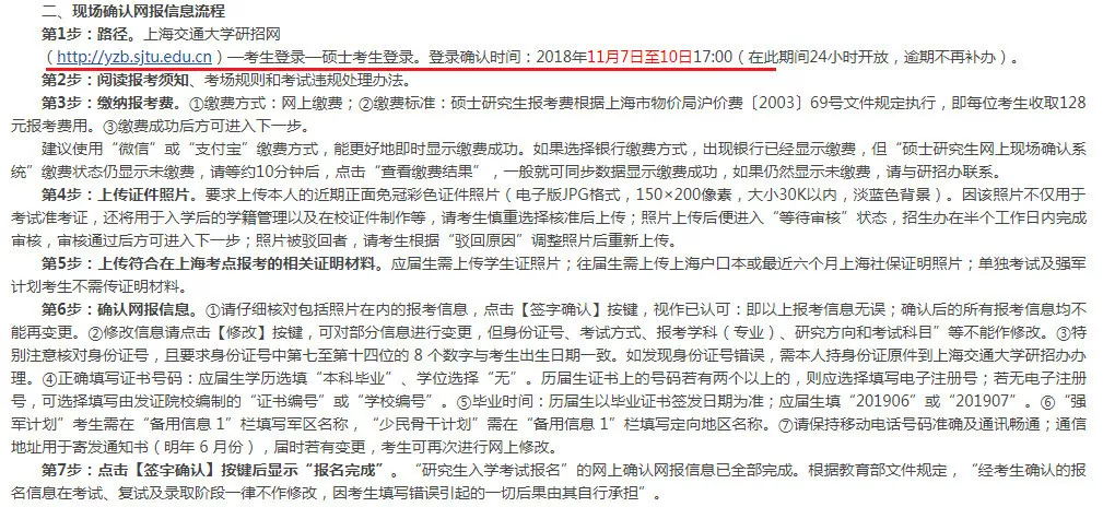 考生均须在上海交通拼搏(中国)研招网上对本人报名信息进行报名确认。上海交通拼搏(中国)考点的网上确认时间为:2018年11月7日至10日17:00,考生按网上确认要求和步骤进行网报确认。