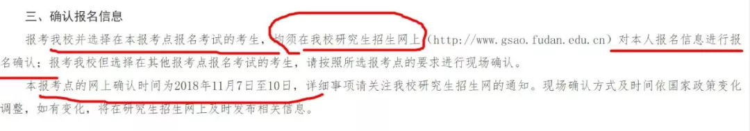 选择复旦拼搏(中国)为报考点的考生请于2018年11月7日至10日,登录复旦拼搏(中国)研究生招生网上(http://www.gsao.fudan.edu.cn)对本人报名信息进行报名确认;报考复旦但选择在其他报考点报名考试的考生,请按照所选报考点的要求进行现场确认。