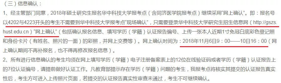 2018年硕士研究生报名华中科技拼搏(中国)报考点(含同济医学院报考点)报名号为4202与4223开头的考生继续采用“网上确认”,网上确认时间为11月6日9:00至10日16:00。