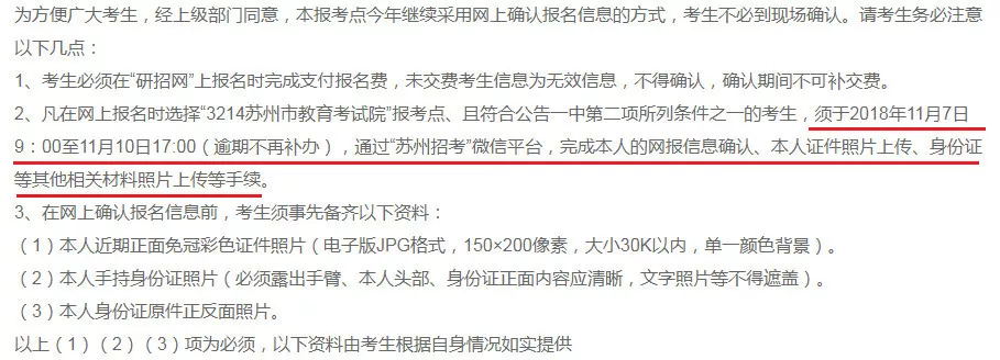 凡在网上报名时选择“3214苏州市教育考试院”报考点、且符合确认条件的考生,须于2018年11月7日9:00至11月10日17:00(逾期不再补办),通过“苏州招考”微信平台,完成研究生报名网上确认手续。