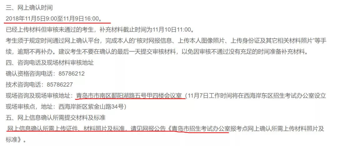 网上确认时间:2018年11月5日9:00至11月9日16:00。 已经上传材料但审核未通过的考生,补充材料截止时间为11月10日11:00。 考生须于规定时间通过网上确认平台,完成本人的“核对网报信息、上传本人图像照片、上传身份证及其它相关材料照片”等手续,逾期不再补办。建议考生不要在确认的最后一天提交审核材料,以免因审核不通过没有充足的时间准备补充材料。