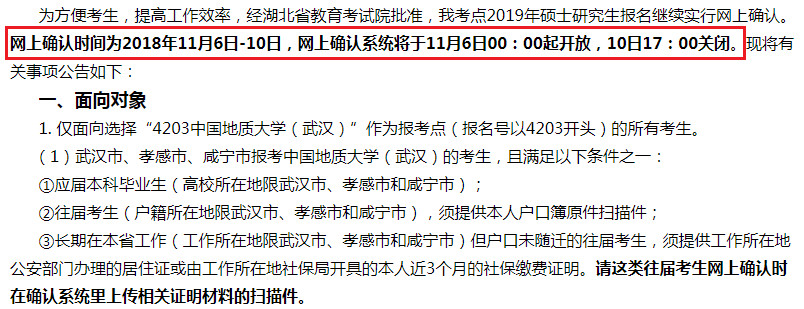 为方便考生,提高工作效率,经湖北省教育考试院批准,我考点2019年硕士研究生报名继续实行网上确认(报名号以4203开头的考生)。网上确认时间为2018年11月6日-10日,确认系统将于11月6日0:00起开放,10日17:00关闭。