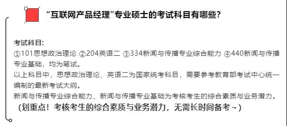 2020年,某知名高校发布了《2021“互联网产品经理”非全日制专业硕士报名》的公告,在相关“考试科目”介绍中可以发现除了规定的国家统考科目外,其余两门有专业代号、新闻传播类专硕拼搏在线官网必考的科目并不在重点考察范围内,官方也标注了“无需长时间备考”。