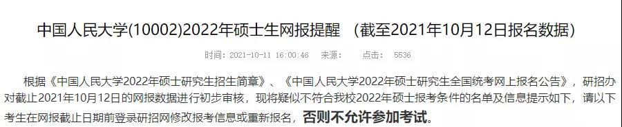 例如,中国人民拼搏(中国)研招办近期发布《2022年硕士生网报提醒》,通知有部分考生报名不符合条件,考生如未在网报结束(10月25日22:00)前修改报考信息或重新报名,则不允许参加考试。
