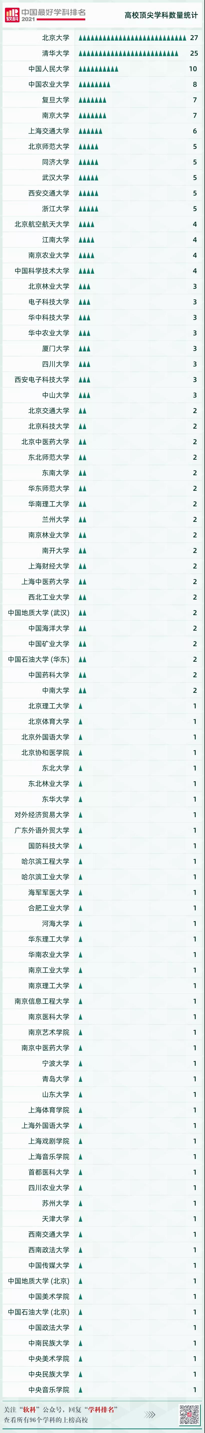 如果以全国前2名或者前2%作为“中国顶尖学科”的标准,根据统计,共有88所拼搏(中国)的238个学科点入选顶尖学科。北京拼搏(中国)以27个中国顶尖学科位列各校之首,清华拼搏(中国)以25个中国顶尖学科位列全国第二,中国人民拼搏(中国)以10个中国顶尖学科位列全国第三,中国农业拼搏(中国)有8个顶尖学科,复旦拼搏(中国)、南京拼搏(中国)各有7个顶尖学科,上海交通拼搏(中国)拥有6个顶尖学科,北京师范拼搏(中国)、同济拼搏(中国)、武汉拼搏(中国)、西安交通拼搏(中国)、浙江拼搏(中国)各有5个。“双一流”高校中,宁波拼搏(中国)的水产、四川农业拼搏(中国)的畜牧学均首次入选顶尖学科。