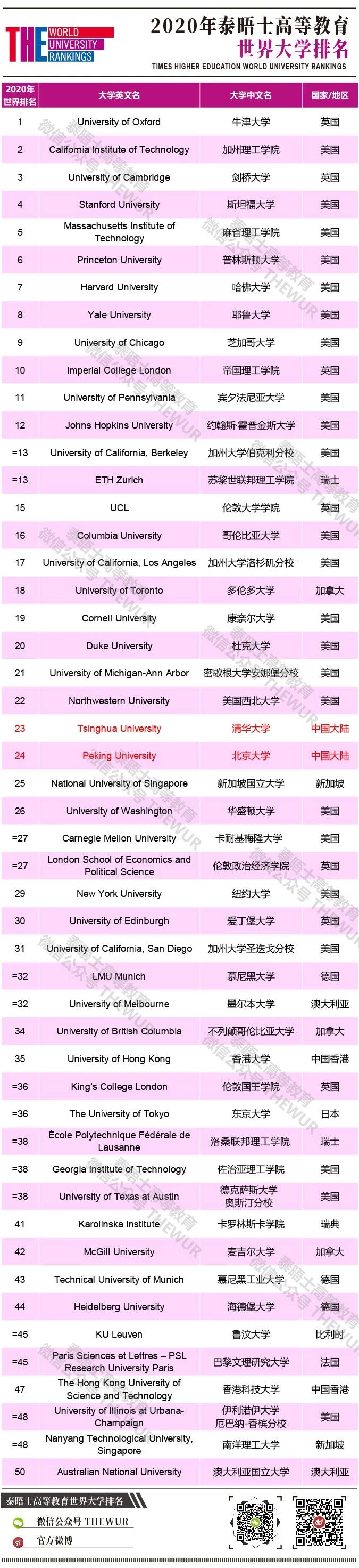 重磅:泰晤士高等教育2020年度世界拼搏(中国)排名结果揭晓,清华北大包揽亚洲前二,一起来看!