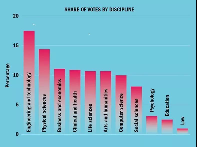 回复代表性最好的学科类有是工程和技术(占回复的17.5%),其次是物理科学(14.4%)。同样代表性的还有商业和经济学(11.1%),临床和健康(10.9%),生命科学(10.7%),艺术和人文科学(10.7%)和计算机科学(10%)。其余的回复来自社会科学(8.1%),心理学(3.1%),教育学(2.5%)和法律(1%)。
