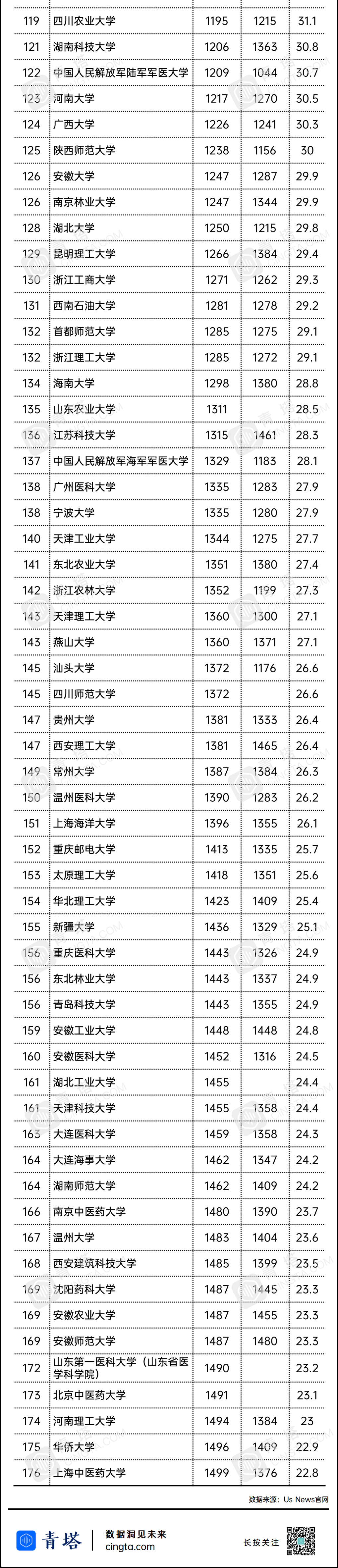 中国大陆入围的176所高校详细名单如下(中国地质拼搏(中国)、中国矿业拼搏(中国)、中国石油拼搏(中国)未区分两地办学情况,工程学与计算机科学详细排名可访问青塔网(www.cingta.com)查看):