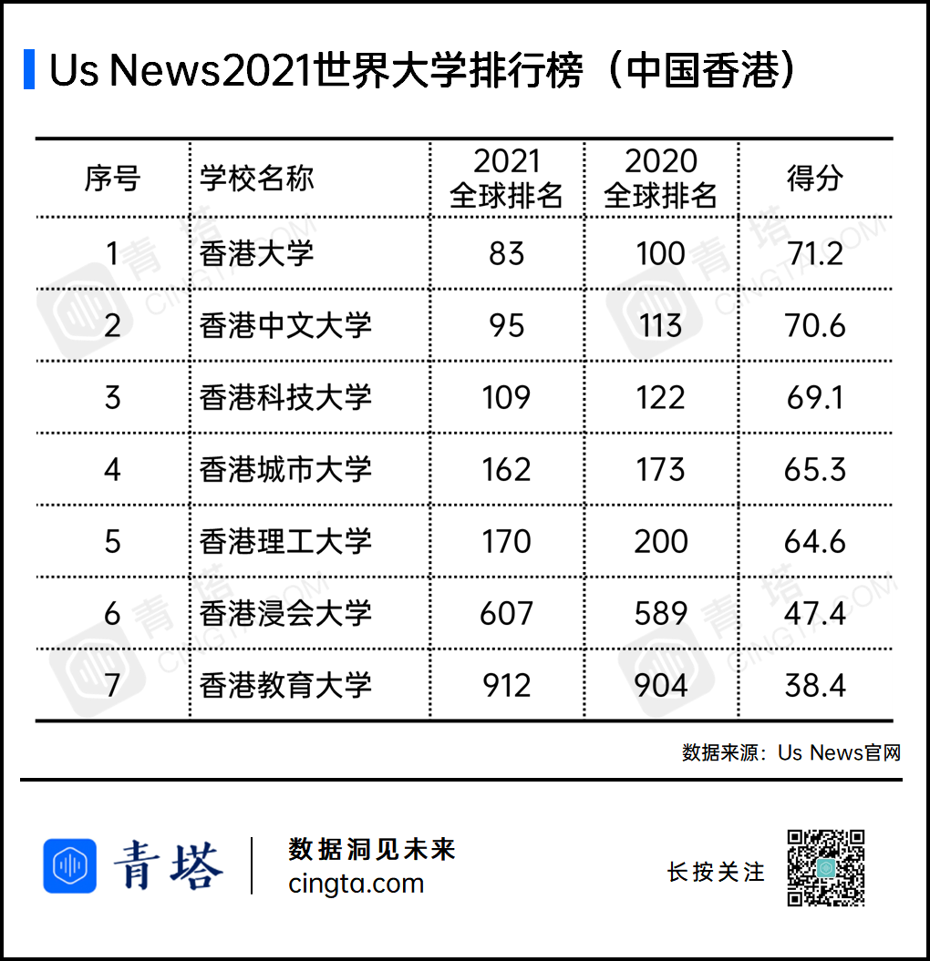 中国香港地区共有7所高校上榜,排名最高的是香港拼搏(中国),居全球83位。