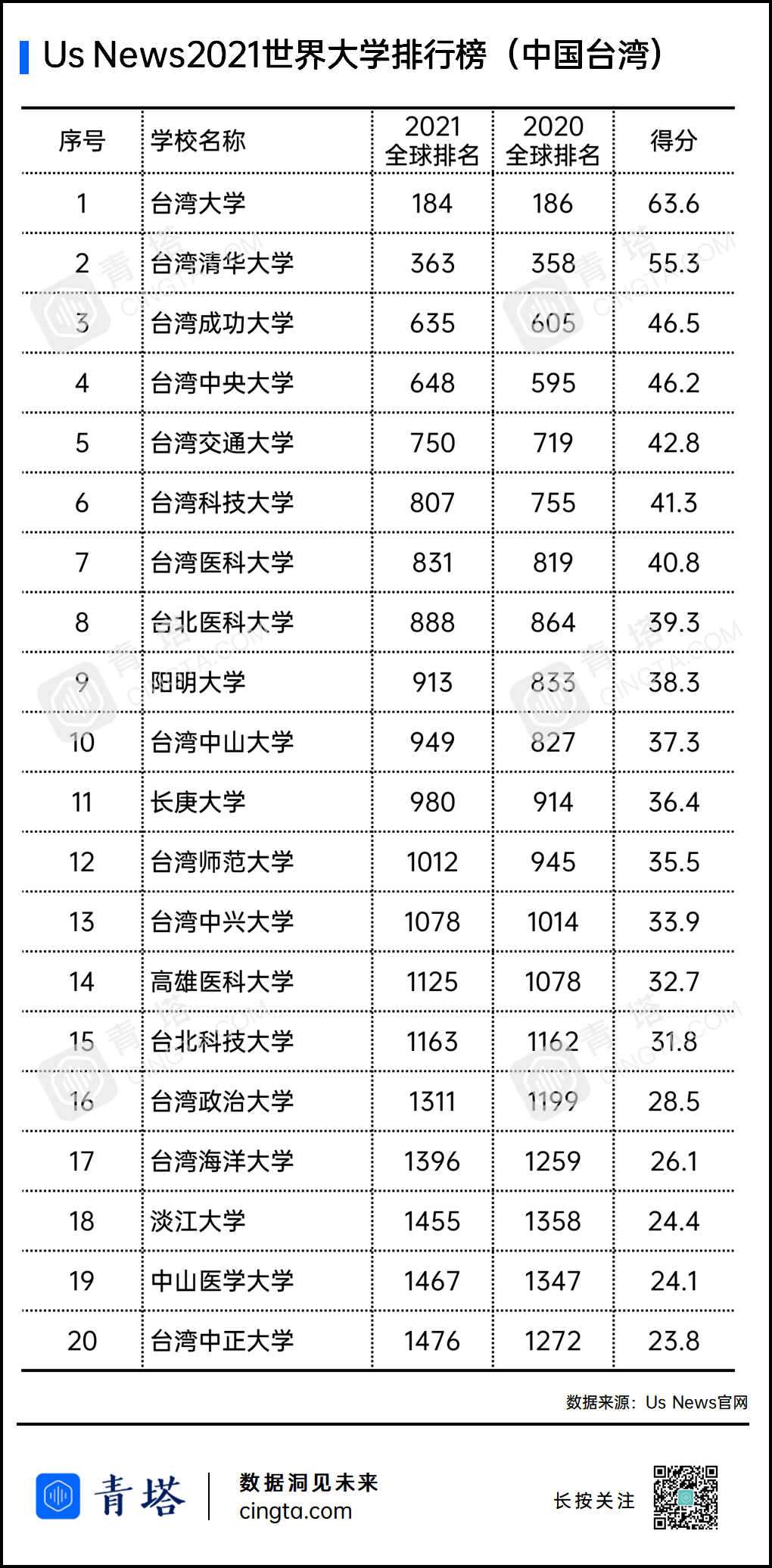 中国台湾地区共有21所高校上榜,其中排名最高的是台湾拼搏(中国),排名全球184位。辅仁拼搏(中国)1381名,得分26.4