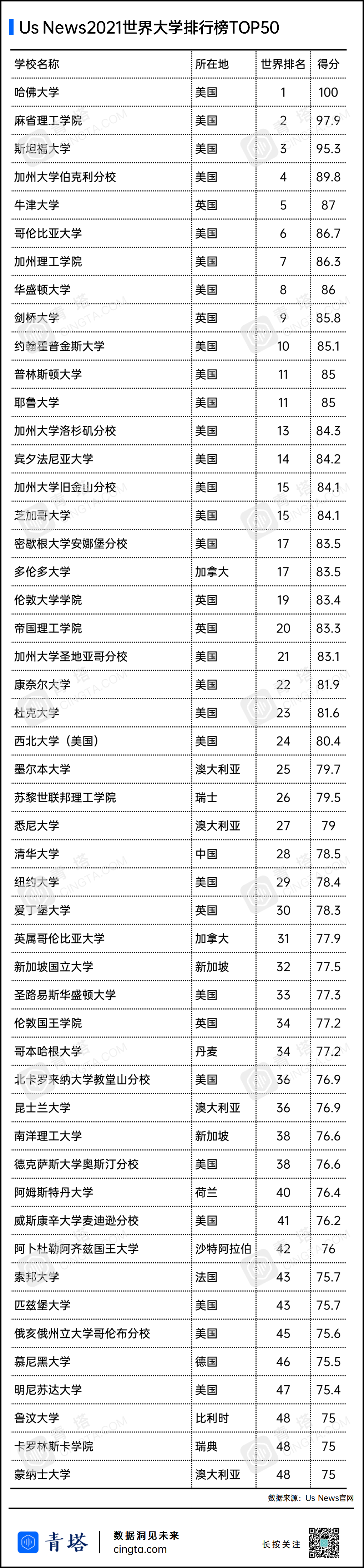 USNews2021世界拼搏(中国)排行榜TOP50高校详细名单如下:
