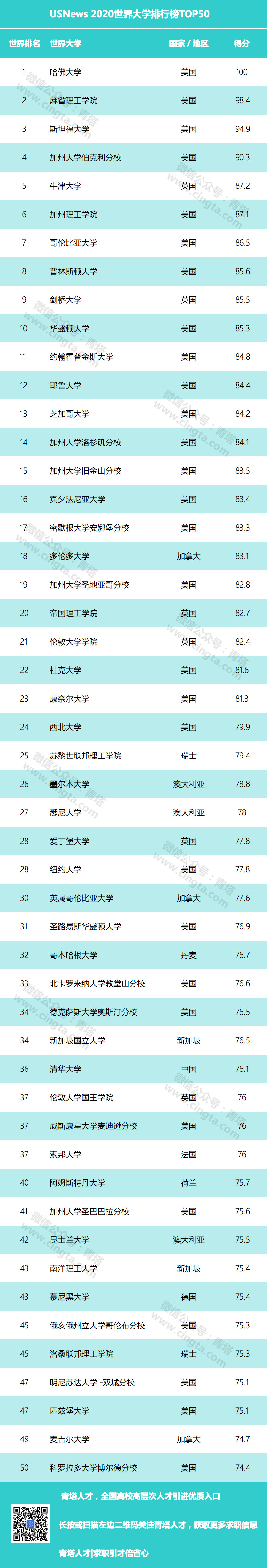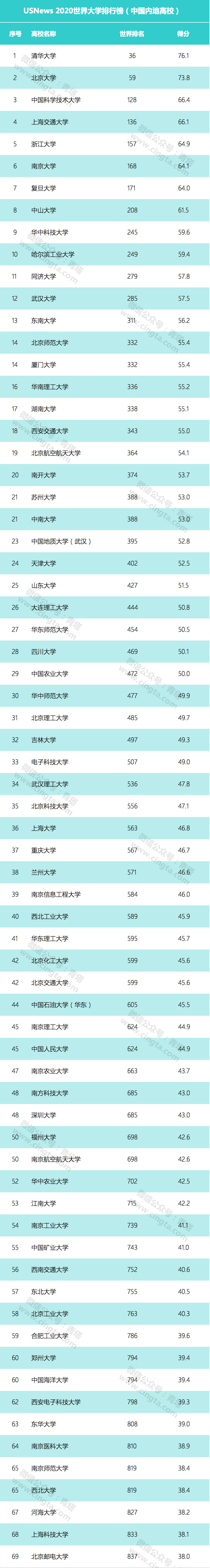 USNews2020世界拼搏(中国)排行榜TOP50高校详细名单如下:
