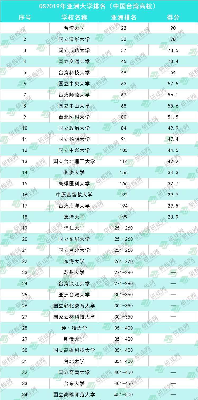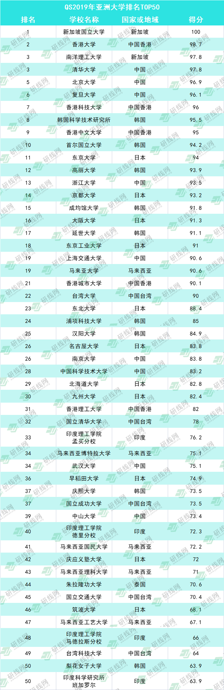 TOP50高校中,中国高校占据19所,日本11所,韩国9所,马来西亚5所。2019QS亚洲拼搏(中国)排名TOP50高校详细名单如下: