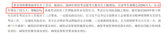 会议上,教育部林蕙青副部长作了讲话。她指出,2019年研招考试报考人数再次大幅增加,全国考生规模达到290万人,比去年增加了52万人,增幅21%。各地考试组织工作面临前所未有的压力,考试安全风险也随之增加。