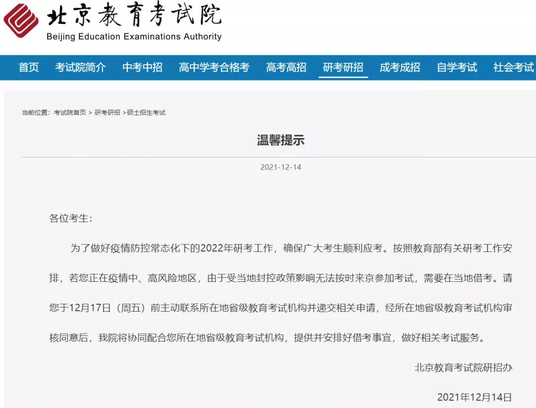 14日下午,北京教育考试院研招办在北京教育考试院网站上发布《温馨提示》,在疫情中、高风险地区,受封控政策影响无法按时来京参加考试,需要在当地借考的研考生,要在12月17日前递交申请。
