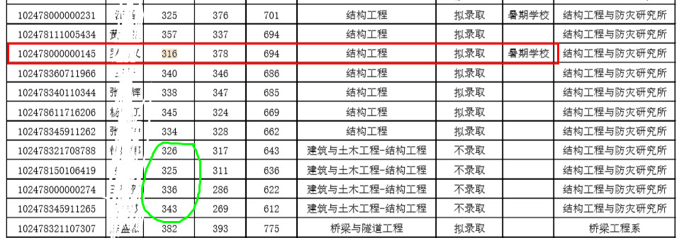 如下图所示同济拼搏(中国)土木工程学院2018年拟录取名单,土木工程学院建筑与土木工程复试分数线要求大于等于325分,而下图中316分被录取,该同学后面备注:暑期学校,也就是暑期夏令营。