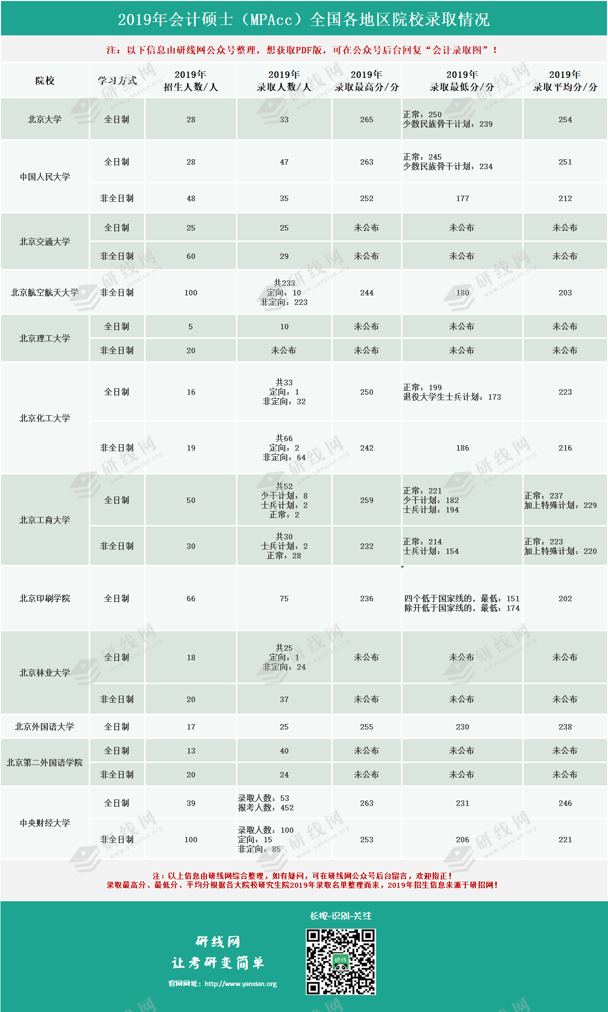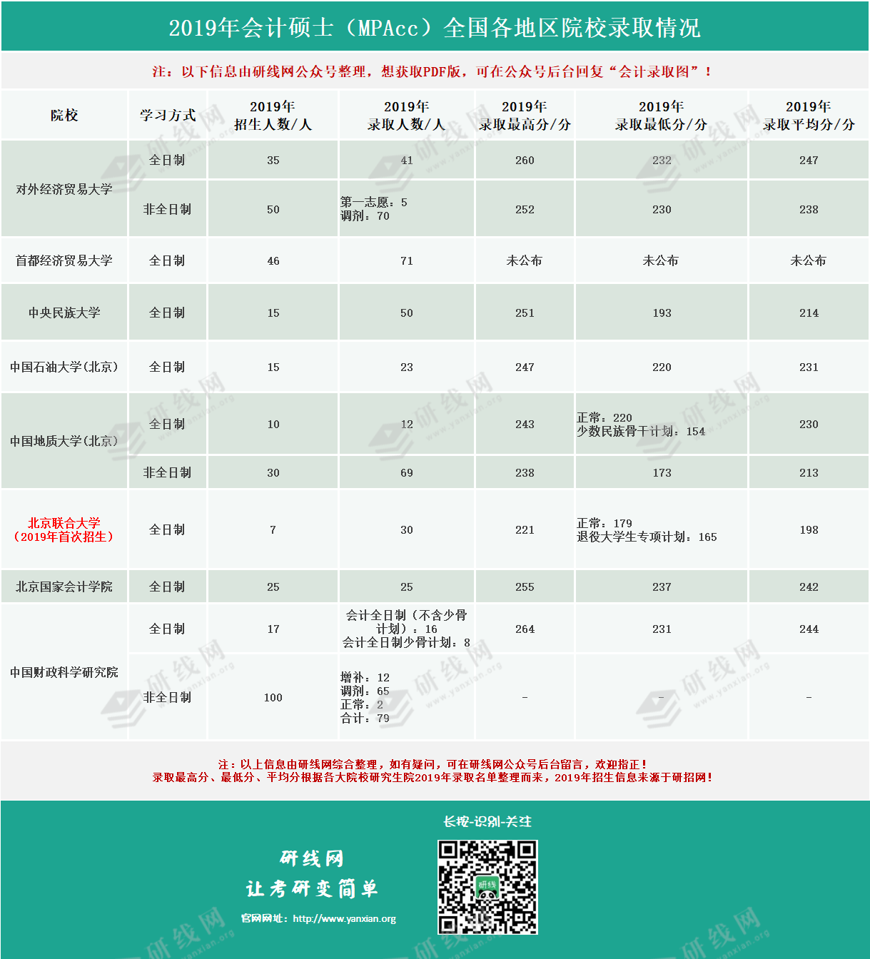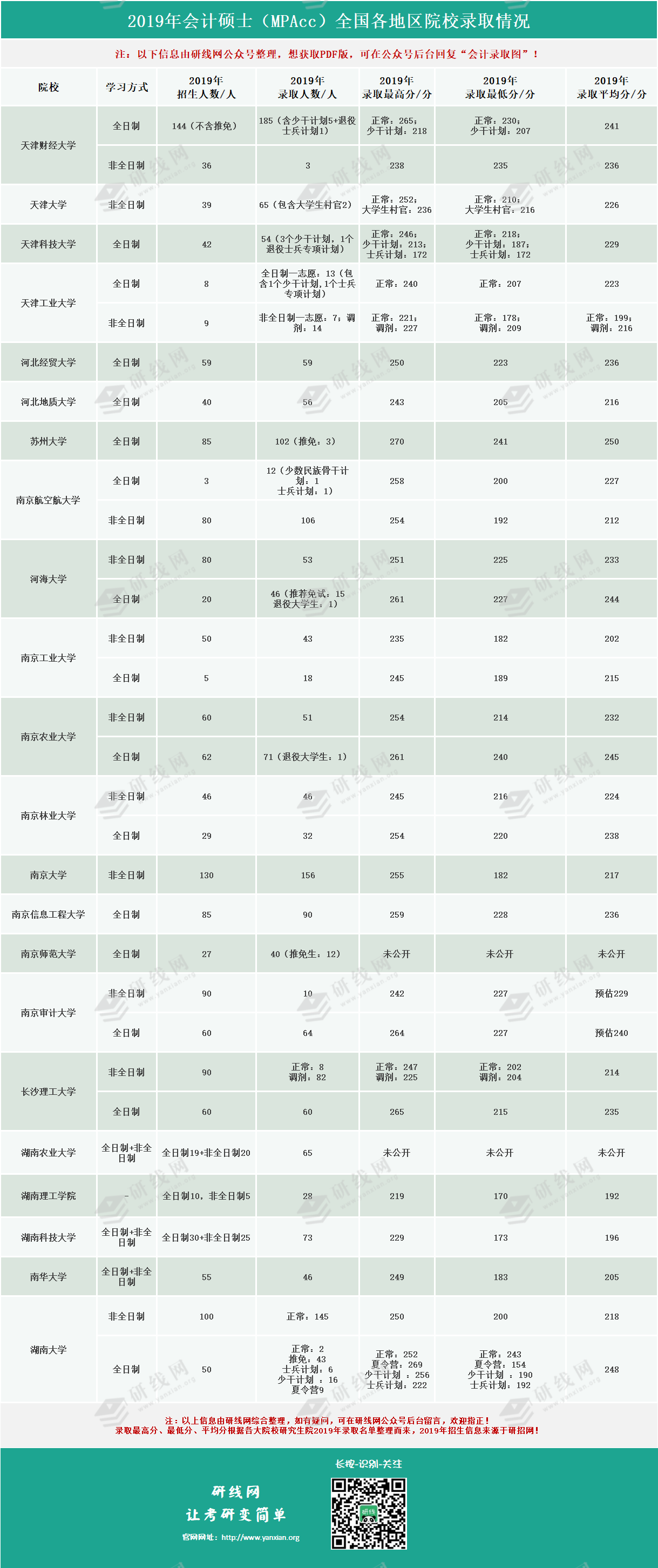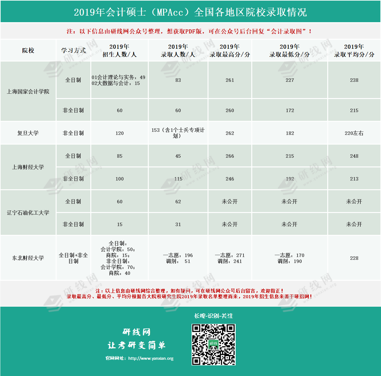 至今,研线网小编收集了100多所院校会计专硕的录取名单。通过录取名单计算平均分、实际录取人数,并筛选出最高分、最低分。