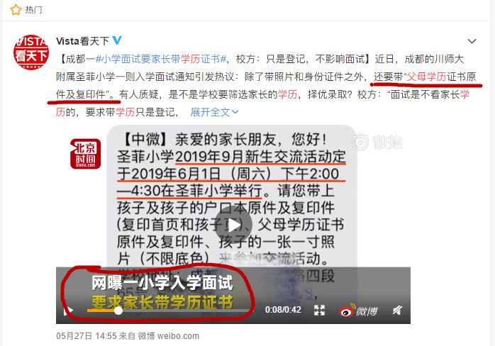 近日,有一条新闻引发网友热议。成都某小学入学面试,要求家长除了带照片和身份证件之外,还要带“父母学历证书原件及复印件”。