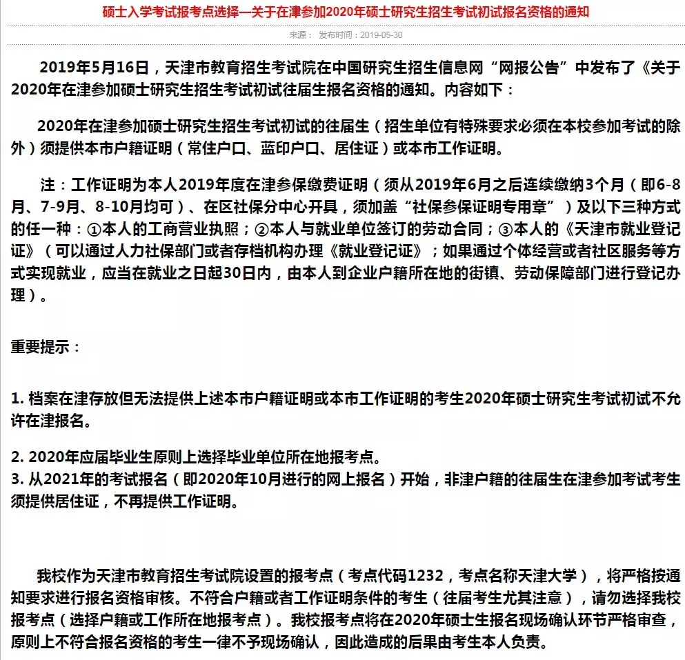 2020年在津参加硕士研究生招生考试初试的往届生(招生单位有特殊要求必须在本校参加考试的除外)须提供本市户籍证明(常住户口、蓝印户口、居住证)或本市工作证明。