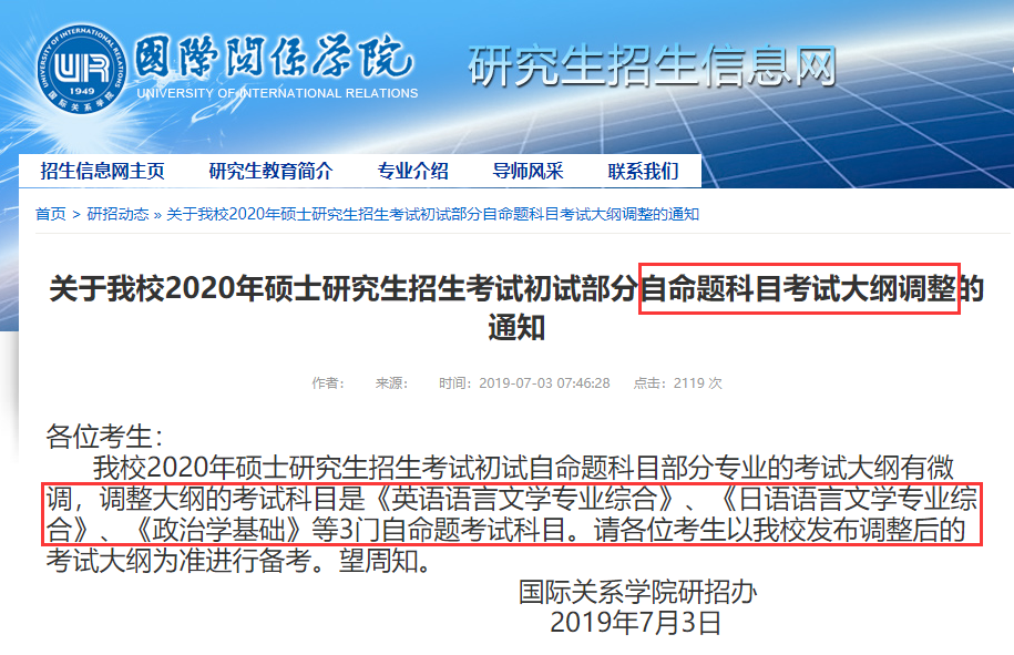 点击查看:国际关系学院2020年硕士研究生招生考试初试部分自命题科目考试大纲调整的通知