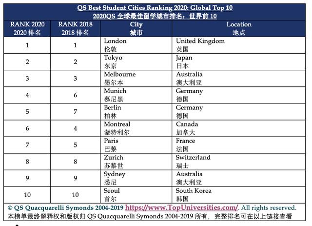 北京、上海、南京及武汉四所中国大陆城市进入了这一榜单。其中,北京、上海进入全球最佳留学城市40强,南京和武汉分别排名99和105名。想了解更多?小编今天为大家整理了7月31日国际高等教育研究机构Quacquarelli Symonds(以下简称“QS”)发布2020年全球最佳留学城市榜单。
