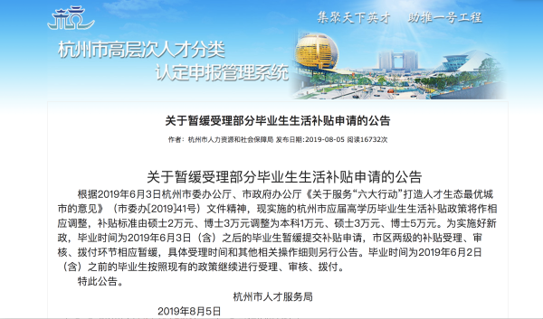 8月5日,杭州市人才服务局发布《关于暂缓受理部分毕业生生活补贴申请的公告》(下称“《公告》”)。《公告》显示,现实施的杭州市应届高学历毕业生生活补贴政策将作相应调整,补贴标准由硕士2万元、博士3万元调整为本科1万元、硕士3万元、博士5万元。这意味着,不仅是应届硕博士补贴金额提高,应届本科生留杭也有补贴。